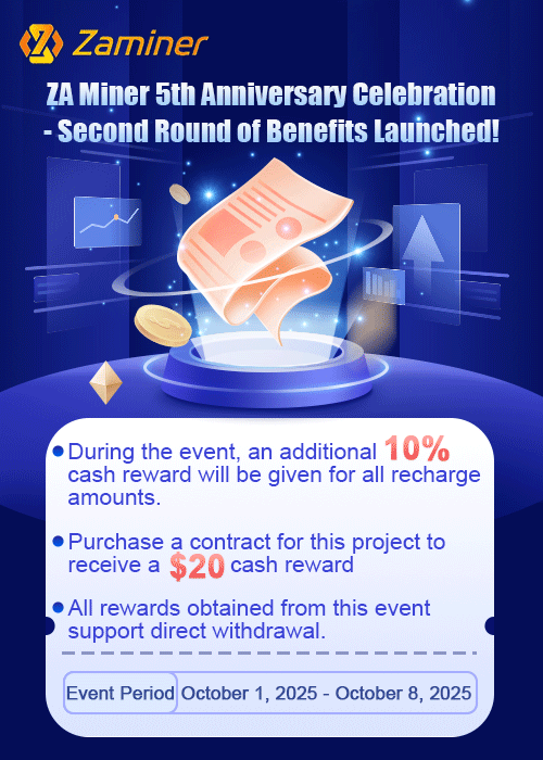The first round of our fifth anniversary promotions received rave reviews and support from our customers. To thank them for their trust and love, we've decided to offer a second round of exclusive benefits! Two core benefits are directly offered with full sincerity: (Activity 1) Enjoy an extra 10% cash reward when you top up: No matter how much you top up, you can immediately get an extra 10% cash back - the more you top up, the more extra rewards you get, and there is no upper limit to the benefits! (Event 2) Purchase designated contracts and instantly receive $20-$377,777 in instant cash. In addition to the deposit bonus, purchase designated project contracts on the ZA Miner platform during the promotion period to unlock significant cash bonuses: bonuses range from $20 to $377,777. All bonuses are available with no minimum deposit and can be withdrawn immediately, ensuring your profits are instantly pocketed! The promotion runs from October 1st to October 8th. Don't wait for us! Seize this limited-time opportunity to reap the exclusive rewards and embark on a new chapter in cloud mining with us!